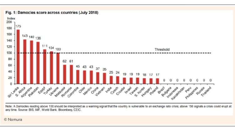 Recientemente el Financial Times publicó una nota sobre exposición al riesgo cambiario en mercados emergentes, dando cuenta de la publicidad del Índice Damocles elaborado por el Banco Namura (en la ilustración principal de esta nota). El país más expuesto a sufrir corridas cambiarias es Sri Lanka, ubicada al sur de la Inda y conocida como la isla de los mil nombres. El segundo país es Sudáfrica, cuyo Presidente del Banco Central se desmarcó de la situación de fragilidad financiera que vive nuestro país hace unas pocas semanas. Y a nosotros nos tocó el tercer lugar, con un puntaje de 140 sobre 200, que mide la máxima exposición (referencialmente, 100 es el umbral que diferencia la región entre economías emergentes con baja y alta exposición). Turquía quedó muy por detrás, es decir que la verdadera tormenta la causó el gobierno argentino.